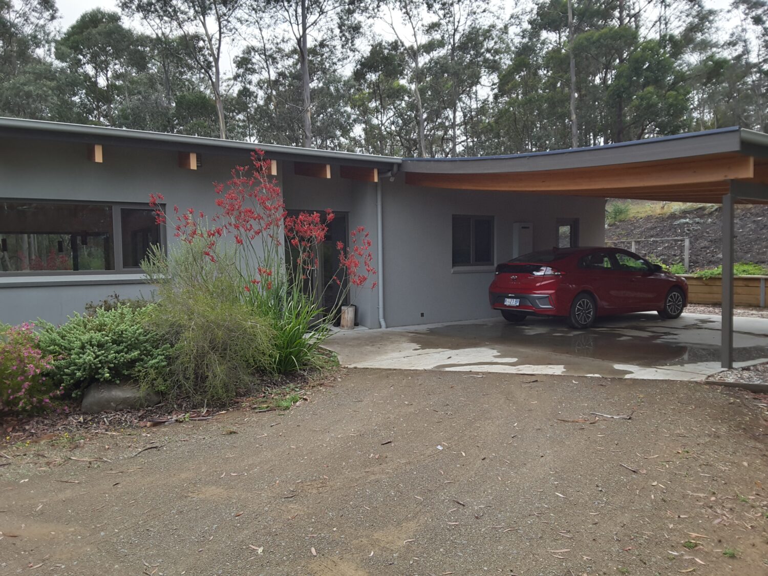 I’ve spent much of my life living aboard my home built cruising yacht. This lifestyle requires constant attention to the preservation and efficient usage of resources a concept that has carried over to my design and life habits in this new house. Utilising curves inside and out reflecting my love of nature, the house is built of polyfoam blocks on a concrete slab with double glazed pvc frame windows and doors and is fully electric. Heat pump hotwater, heat pump heating, an induction stovetop and an EV are all powered by solar. My monthly energy bill is >$50/month credit.