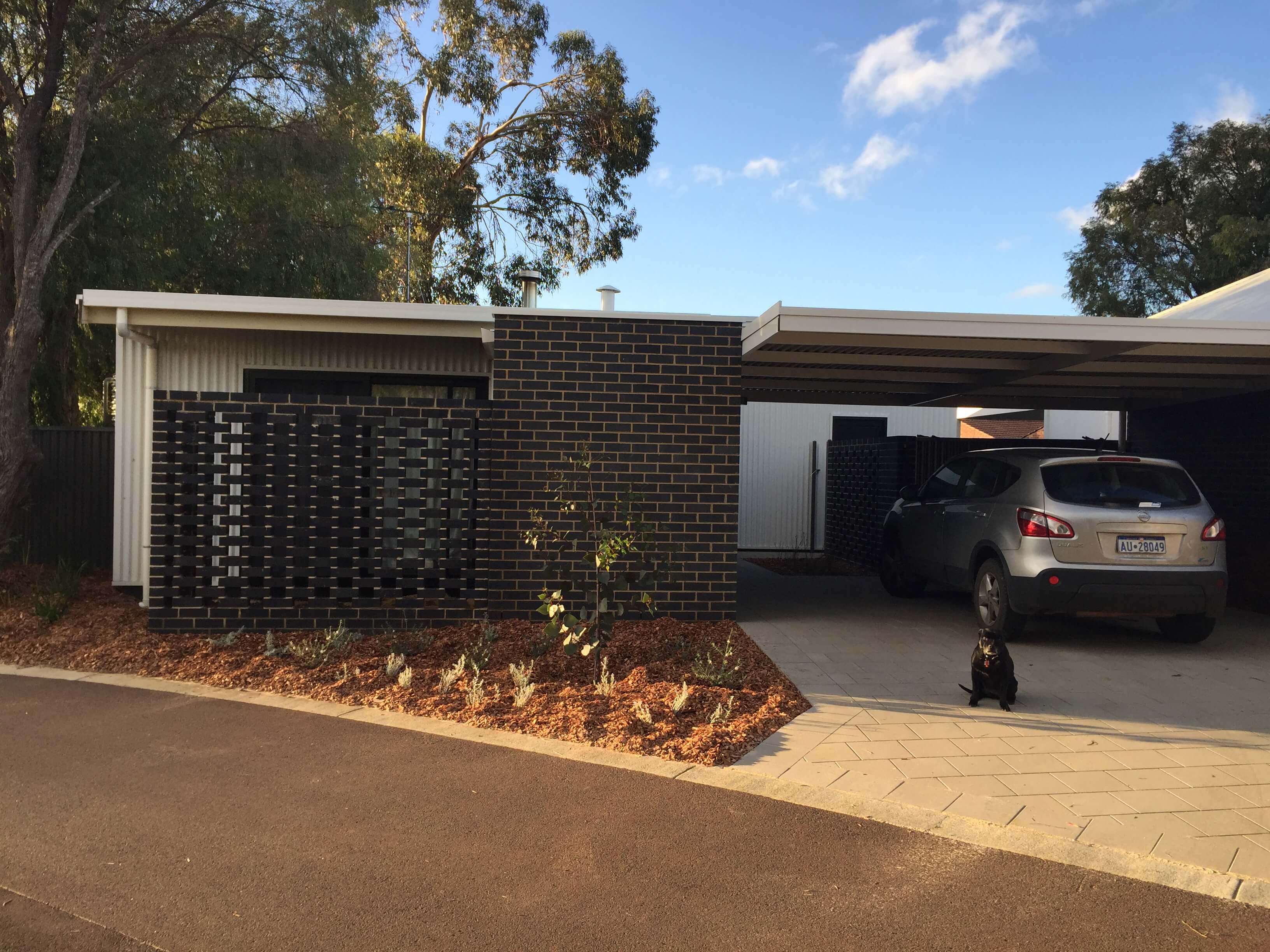 Mature peppermint trees have been retained on the site, with naitive planting forming a key part of the landscaping to provide habitat for the endangered Western Ringtail Possum. The design has utilised water sensitive design elements such as rain water storage and reuse (plumbed to toilet and washing machine), rain gardens and a wicking bed for food production.