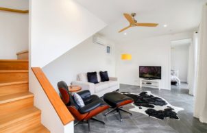 As almost all the internal and external linings were asbestos cement sheets (fibro), they had to go, leaving just the original hardwood frames. The walls were re-clad in colorbond steel and Weathertex weatherboards and sheets in a matrix pattern – they have excellent environmental credentials and are reminiscent of the original material used to build the cottage. Weathertex is compressed hardwood sheet without any glues or harsh chemicals and can be used in variety of ways. It is locally made and carbon-positive.