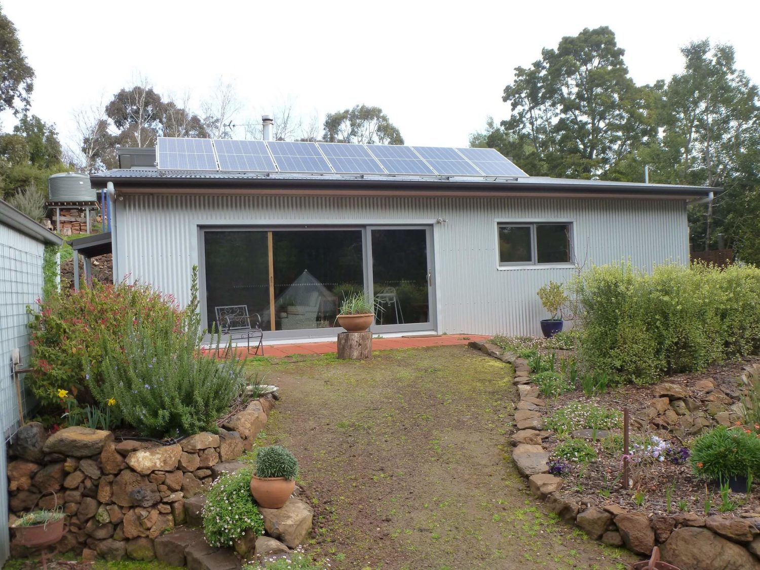Four kilowatt solar panels are complemented with all-LED lights, induction cooktop and Siddons heat pump for hot water heating. Wood heater for warmth. Own water collection and management. Working on a large food production system, including food-bearing trees.