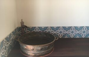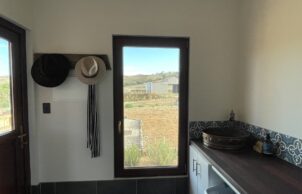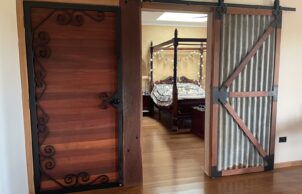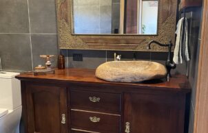 Everything used in the house has a story; a large majority of the wood featured is salvaged wood we collected over years, the bathroom sink is carved from a stone from our property and the fireplace is also made from our own stone, the remaining sinks are hand beaten copper, and all metalwork and woodwork was done by my husband. We have beams collected from the old Whyalla jetty, wood panels from an old local shearing shed featured in the kitchen, and our front door is made from pallet wood.