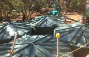 With a total roof area of 240m2 (including all sheds/outbuildings), rain water is harvested via custom made, extra capacity gutters (to cope with tropical type storms). To try to keep the water as clean as possible, the following systems are fitted: metal leaf gutter guard, double filter screen rain heads, ‘first flush’ units, and ‘Maelstrom’ cyclonic type filters. Total storage capacity is 112,000 Ltrs. This is used for bush fire defense via roof top sprinklers, vegetable garden, fruit trees, general garden, and, after further filtration, for kitchen and drinking.