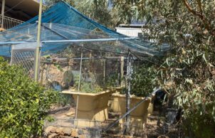 Part of the vegetable garden incorporates salvaged baths on plinths. Shade-cloth protects the vegetables in summer, but allows in the winter sun. The whole vegetable patch is enclosed in wire mesh to keep vermin, especially possums, at bay. Kitchen scraps, vegetable and grass cuttings are all composted. Fruit trees include nectarine, mulberry,mandarin, orange, apricot, almond, apple and a young mango.