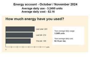 Going all electric resulted in impressive savings to our energy costs. Our total power usage in the last twelve months in our previous house averaged $112 per month, including service fees. In the first 12 months in our new house our energy cost averaged only $40 per month. In the previous house we had 1.6kw solar on the roof and used gas for hot water and cooking. Now we have electric cooking (induction) and solar hot water but no solar panels in the roof. With two people in permanent residence and the occasional houseguest, we’ve never needed the hot water booster. The major electrical cost beyond the service fee in the previous house was the running of our reverse cycle aircon, regularly in winter and occasionally in summer. We no longer have or need air conditioning and can’t yet justify roof-top solar because our energy usage averages less than 4 units per day. We do plan to add rooftop solar when we eventually purchase an electric vehicle.