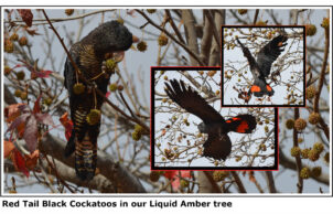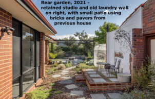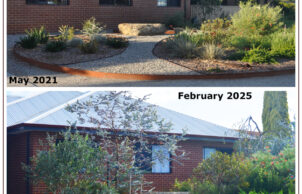 The large liquid amber tree we lost due to the rebuild was often visited by black cockatoos. It has been replaced by native trees that offer more beneficial nourishment and after five years these have reached the height that we anticipate will attract these wonderful visitors back to our garden. We do not provide food beyond the great variety of native plants we’ve put in for the purpose, but we do provide water for all our wildlife, in saucers at ground level for lizards and insects and various heights of bird baths, in areas both open and protected, to accommodate all of our birds. Feathered friends who have taken up residence or visit regularly include wattlers, several varieties of honey eaters, willy wagtails, magpies, mudlarks, galahs, corellas and a lone butcher bird.