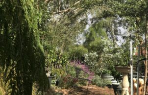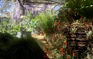 Mixed garden planting comprising plants of low water requirements, local endemic natives, as well as wicking vegetable beds, bountiful fruit and nut trees (double grafted lemon-lime, kaffir lime, two types of oranges, plum, nectarine, cherry, almond, muntries, thyme, oregano, rosemary, parsley, warrigal greens, plus annual vegetables). We have created a microclimate with beautiful gardens, pergolas and plantings to manage the heat and cool outside given our considerable seasonal and diurnal temperature extremes.