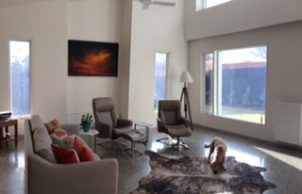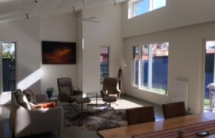 The whole house is on one level. The slab is insulated concrete, polished for easy care. The living room wall is natural stone. Both these features assist to retain winter warmth. So far, the internal temperature over winter has not dropped below 17 degrees Celsius.