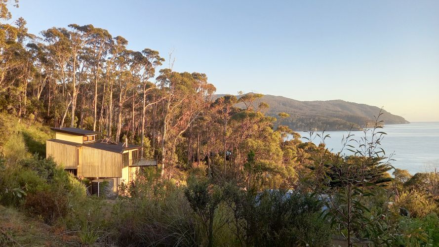 Eaglehawk Nest is a small home built in 2021, for a couple living on the Tasman Peninsula, not far from Port Arthur. The narrow, steep block, the vegetation and the wastewater treatment system forced the location of the house to the middle of the hill, which made access difficult, but the resulting view across the Bay is stunning. Uta says the slight curve of the Eastern façade, out to the view, “is offering a hugging gesture to the bay”.