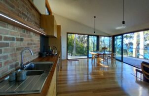 All rooms face the bay, and because the generous glazing faces East, overheating in the Tasmanian climate is unlikely. Thermally broken aluminum framed doors and windows with ember mesh have been installed for heightened energy efficiency and bushfire resilience, to BAL-40.