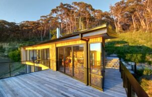 Clients come to Uta Green, from Green Design Architects, for her speciality in sustainable buildings and bushfire resilience. Building to a high BAL standard is often essential for the Tasmanian areas she works in, as was the case with Eaglehawk Nest.