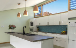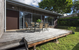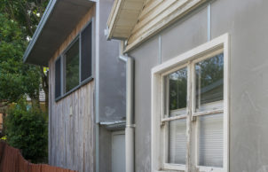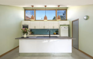 Then we specified a modern and healthy version of fibro – magnesium oxide (MgO) sheet cladding, finished raw like unpainted fibro. MgO has a very smooth shiny face, with a natural concrete-like variegated colouration. This, combined with zincalume cover strips run vertically, ensured the character was maintained, while also allowing R2.5 batts to be installed into the exposed wall frame prior to recladding. The eaves were lined in the same way. The original windows were retained.