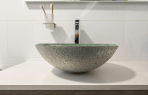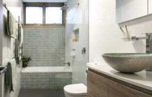 The bathroom incorporates some of our favourite details, and a new one we had to figure out from scratch. The shower screen is embedded in the floor and wall tiles, which can eliminate the need for a frame, silicone or metal support patches. This makes it easy to clean, and that reduces any need for bleach – everybody wins!