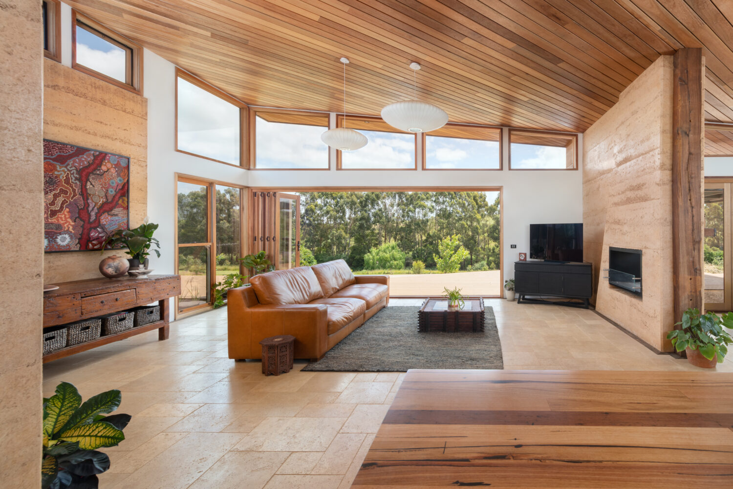 The home also has multiple layers of insulation, with an insulated slab including hydronic heating, double layer insulation to walls, insulation within the external rammed earth walls and high performance insulation to ceilings.