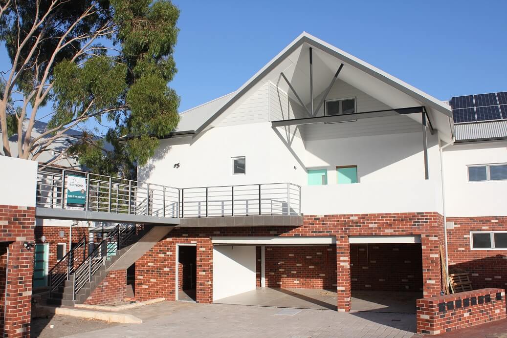 Community of mixed apartments and townhouses sharing communal gardens and bike storage. Extremely high energy efficiency (9+), Gold eTool rating, rain water capture and reuse, PV systems, solar hot water, single garage with provision for e-car, use of reverse brick veneer, double-glazed windows, rooms in loft spaces.