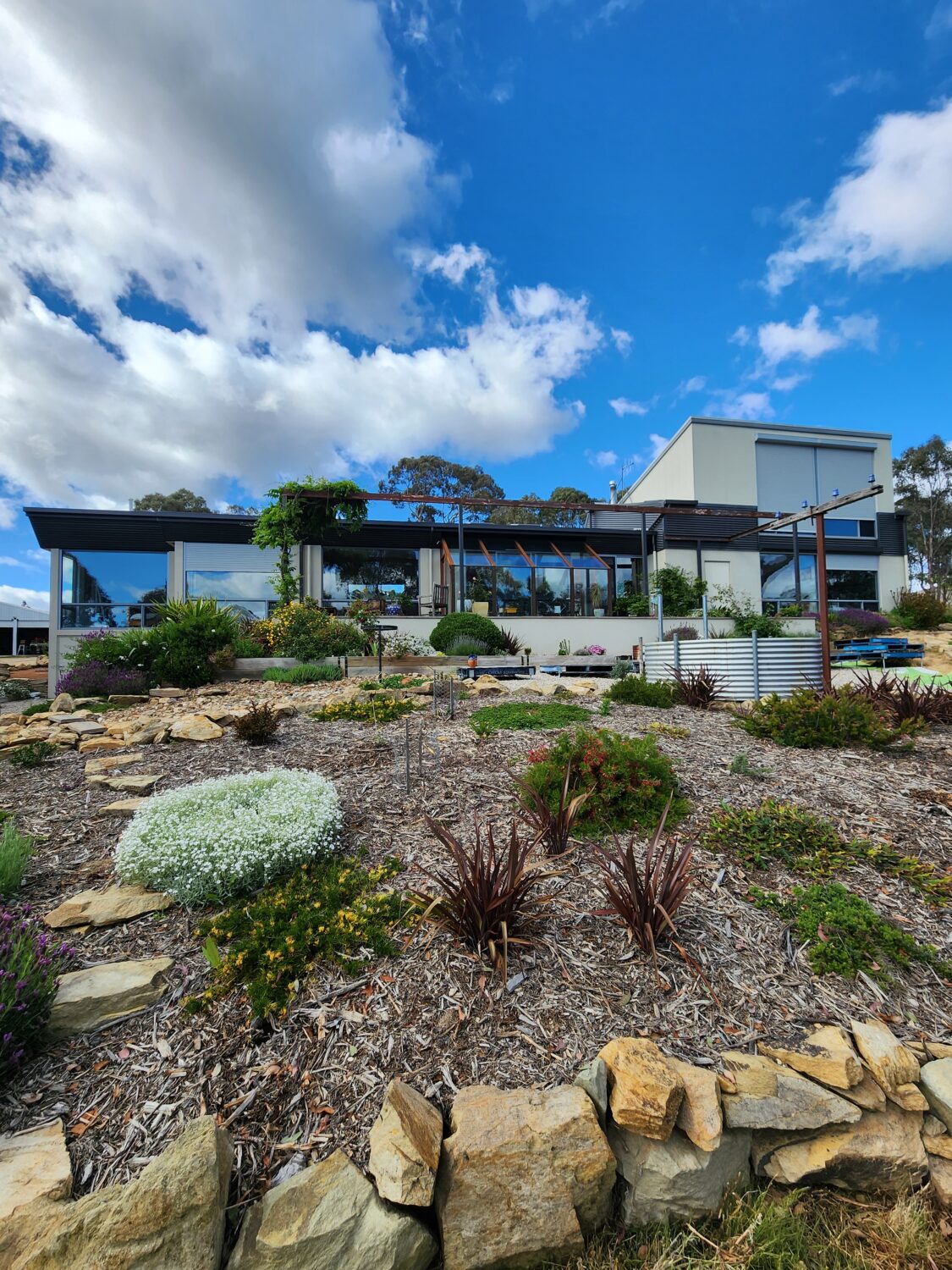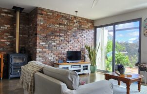 Sustainability is very important to us and informs most decisions we make on our 64 hectare property in the Murrumbidgee River corridor. Our home is an off-grid, north-facing, passive solar building, constructed with Thermacell blocks on an insulated slab. We call it a giant esky! It features double-glazed, thermally broken windows and three layers of cross-knitted insulation in the roof sourced from leftover building supplies (R3.0, R2.4, & R1.3 anticon blanket). Thermal mass is a focus with heat capture facilitated through burnished concrete floors, recycled brick feature walls and sun-exposed internal walls filled with solid core bricks. All gaps around windows and doors are sealed.