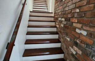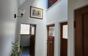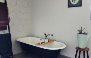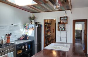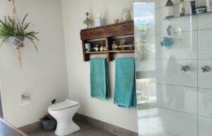The house employs dry composting toilets and 40 Apricus tubes for hot water production. Upcycled fitout includes solid core doors from a knock-down rebuild house, recycled light fittings, balustrades and bricks, upcycled laundry cabinetry, bathroom vanities, bathtub and tiles, and recycled ironbark for benches, stair treads and decking (and probably more we’ve forgotten!).