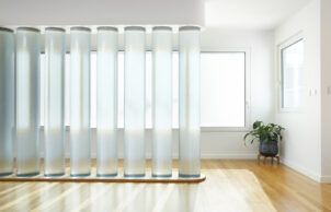 The house is raised to protect the root zone of the tree, and is thus lightweight, lacking thermal mass. This is less significant in a passivhaus than in passive solar. However, the house has 10 internal water tanks to assist in regulating internal temperature. These translucent tanks act as a room divider, framing the entry, while also capturing the sun through a huge north facing window that has a retractable blind for summer sun control. The tanks are not connected to the rainwater tank, as the temperature of rainwater can be problematically low and poses a condensation risk if put straight into the building.