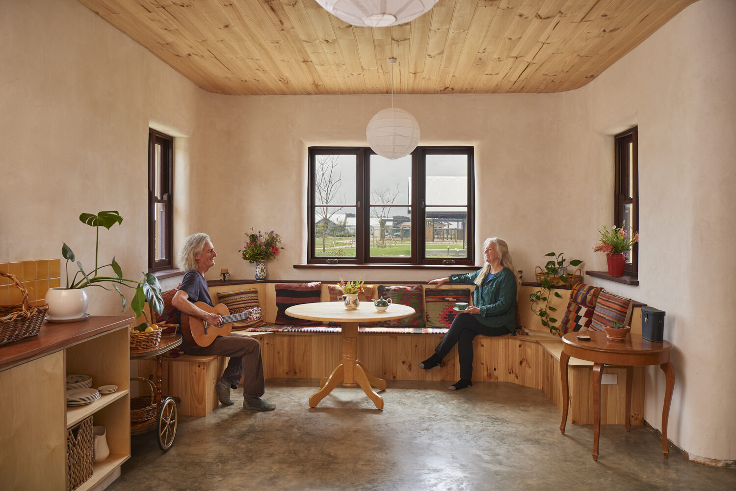 For materials, we went with a burnished concrete floor and zincalume roof (universal here in the village) and timber frame construction with straw bale infill, lime rendered both inside and out. Locally-sourced Australian hardwood weatherboards (wet areas, storerooms, etc) recycled jarrah joinery and pine interior cladding make for a restricted palette of fairly natural, local materials. In contrast, the HWS is a heat pump, the cooking is by induction and the solar panels/inverter talks to the microgrid via the internet.