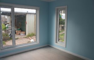 We stripped back the existing house to studs, moved a few walls to make the living space more homely, and added a new north-facing main living area on a waffle pod concrete slab. We have added extensive insulation in the ceilings, walls and floors where possible, and replaced all windows with uPVC framed double glazed units.