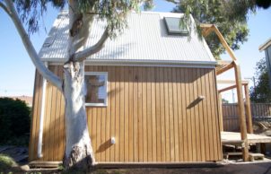 Friends Dan (designer) and Vicky (building energy efficiency practitioner) wanted to stretch their knowledge and principles to build a compact house on a challenging site in Geelong. Combining a passion for energy efficiency with a commitment to building design sustainability, the small house utilised the skills and dreams of a small Geelong construction team. To reduce impact on Wadawurrung Country, it is placed alongside a magnificent gum tree and involved minimal earth removal. Native and edible pants surround this unique home. It has been a creative and humbling experience for us all.
