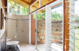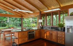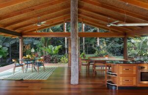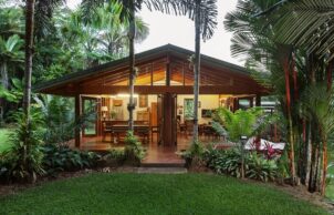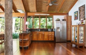 Corrugated steel roofing was used for cyclonic strength and was insulated with an R1.4 blanket backed up with Solomit compressed straw ceiling panels. Walls were also insulated with reflective foil & batts. Living without AC in the tropics requires an open building with cross flow ventilation & ceiling fans. Due to minimum services a home sewerage plant was used & all water was collected in tanks.