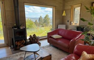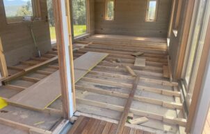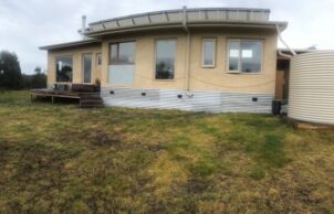 The home is off grid, north facing hempcrete (stud framing) with BIG thermally broken aluminium double-glazed windows, Mega Anchor tripod footings, timber “yellow tongue” subfloor with “seconds” Tassie oak timber floorboards internally and insulation sandwiched between.