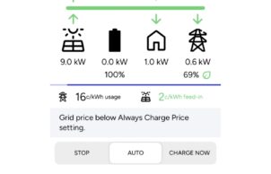 We are signed up to Amber to get access to wholesale electricity pricing, allowing us to sell to the grid at more than 200 times the usual FIT when prices spike. Our average FIT for the last 12 months is 44.3c/kWh. In the last six months, since adding extra panels, we’ve earned $155 at the same time as supplying all of our power needs including cars, spa, sauna, office space, house, and gym.