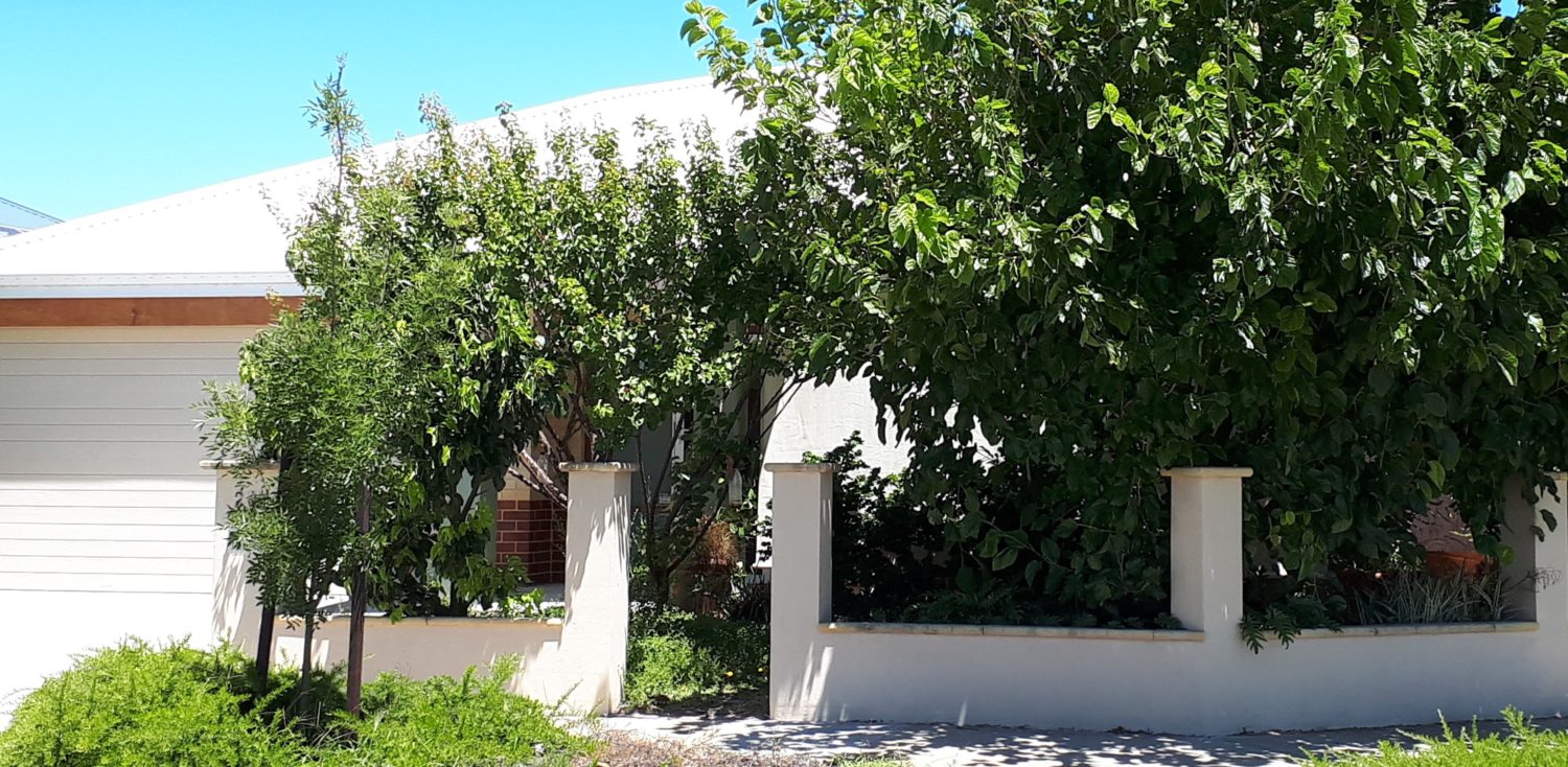 The house has been situated as far to the south and west as possible to allow for a reasonable-sized garden, which features mostly fruit trees. The colorbond fencing has been covered by reed panels in an effort to minimise the amount of heat reflected into the house. To shelter the southern windows from the afternoon sun, we have built manually operated shutters; they also keep the cold out in winter.